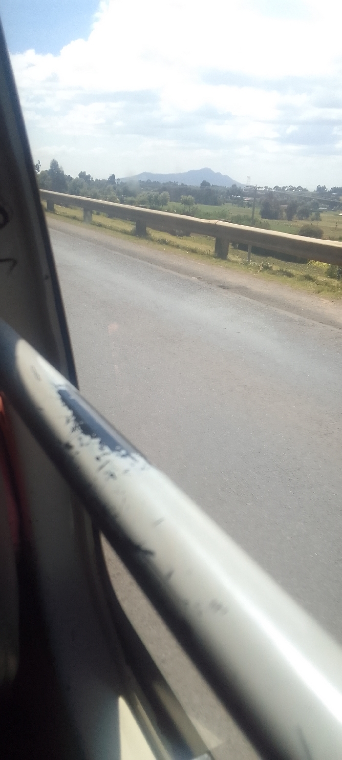 The image displays a daylight outdoor scene from the interior perspective of a moving vehicle in Naivasha East ward, Kenya. The immediate foreground, at the bottom left, shows a portion of a light-grey vehicle interior panel and a diagonal, cylindrical grab bar exhibiting significant paint chipping and wear, revealing a darker underlayer. The midground is dominated by a grey asphalt road, stretching horizontally across the frame, appearing smooth and devoid of immediate traffic. A low, segmented concrete barrier, uniformly beige in color, runs parallel to the road on the right side. Beyond this barrier, a strip of green grass and sparse vegetation is visible. The background reveals an expansive rural landscape featuring numerous green trees, open fields, scattered low-rise structures, and prominent, dark green hills or mountains rising on the horizon beneath a sky with scattered white clouds.