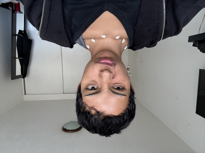 A person with dark hair and an expressive face is facing downward in the image. They are wearing a black hoodie and a delicate necklace with small, white, flower-shaped pendants. The background consists of white walls, a cabinet, a shelf with various items, a television, and a light fixture. The lighting in the room is bright and even.