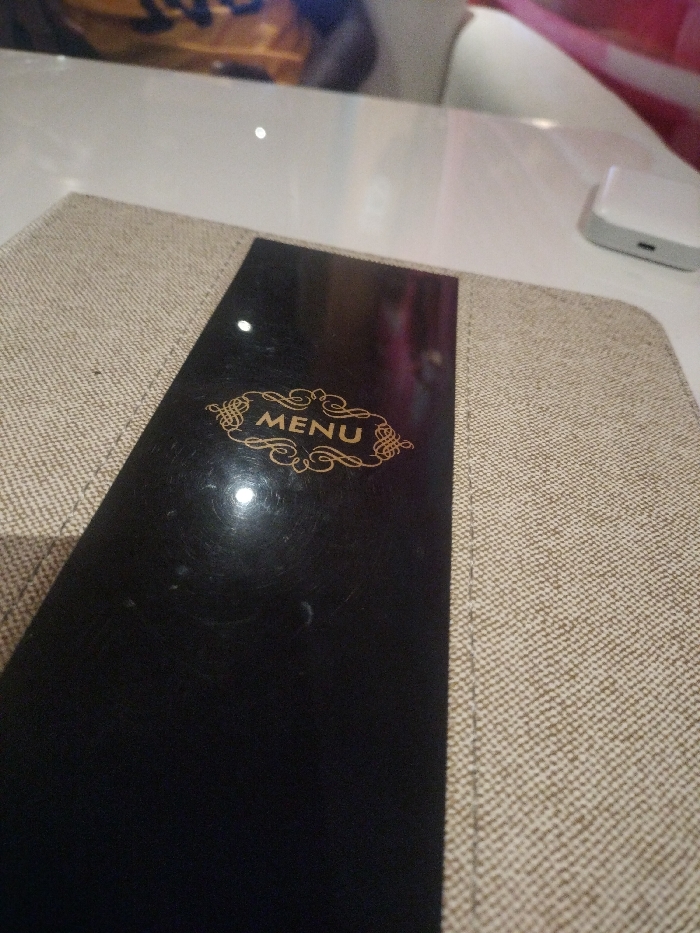 A closed restaurant menu rests on a white table. The menu has a black center panel with the word "MENU" written in gold font, surrounded by decorative gold accents. The outer edges of the menu are covered in a textured beige material. In the upper right corner of the image, a small white device is partially visible.