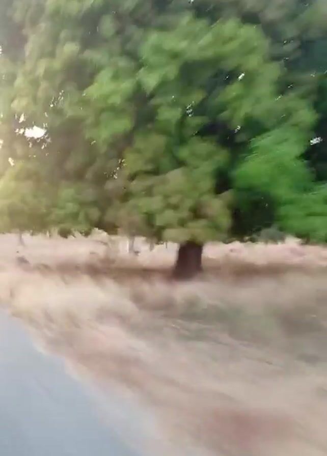 road running through a rural area. The camera appears to be mounted on a moving vehicle, looking out at the scenery. The landscape consists of a field with dry, brown grass and scattered trees. The trees are mostly green, but some appear bare. The road is gray asphalt. The sky is pale and featureless. The camera moves quickly, causing the scenery to blur. There are no people visible in the video.