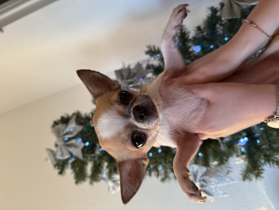 - "The image displays a small Chihuahua dog, predominantly white with light brown markings on its head, ears, and back, held upright by two human hands" by FM-eQUGe2, licensed under CC BY 4.0
