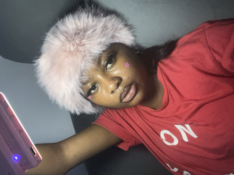 The scene depicts a close-up indoor portrait of a single individual, identified as being in the city of Badore, Nigeria. The subject, a person with dark skin, is centered in the frame, looking directly towards the camera. They wear a light pink faux fur headband or ear warmer. Their facial features include visible eyelashes, glossy light-toned lips, and a small stud in the left nostril. Two small, pink star-shaped adhesive decorations are present on the face: one below the outer corner of the left eye and another on the right cheek. The subject is wearing a red t-shirt with white lettering partially visible on the left side, showing the characters "ON". The right arm is raised, holding a light-colored smartphone or similar device in the upper left portion of the image. This device emits a bright white light from its top edge, with a small blue indicator light also visible, illuminating the subject. The background is indistinct and dark, appearing to be a dark gray or black surface, likely an interior setting.