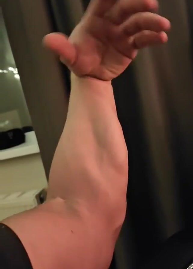 A person's arm is flexed to show off the bicep muscle. The hand is bent back at the wrist, with fingers slightly curled. The skin is light-colored, with a slight redness. Behind the arm, out of focus, is a dark curtain and a window.