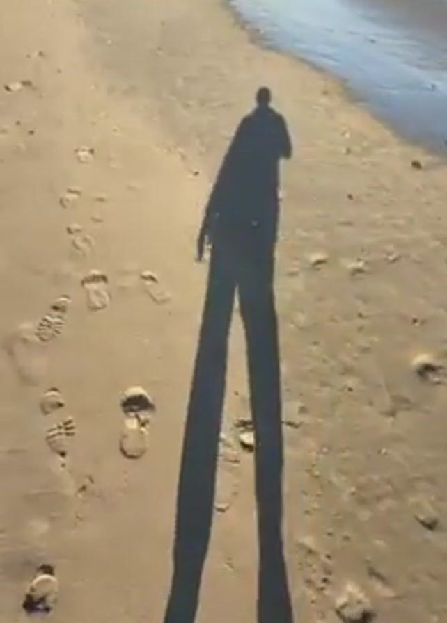 sandy beach with footprints and the shadow of a person walking along the shoreline