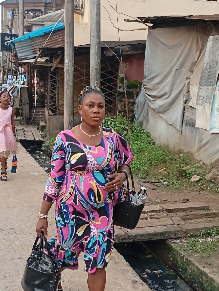 A woman in a colorful dress carries two black handbags while walking on a street. A young girl in a pink dress walks nearby. The street has a makeshift bridge over a drainage ditch with trash. Buildings and utility poles form the backdrop. The woman has blue braids and wears jewelry.