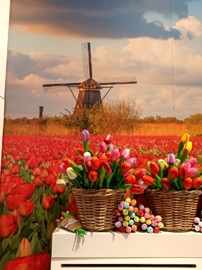 An indoor retail display features a large photographic backdrop depicting a traditional Dutch landscape