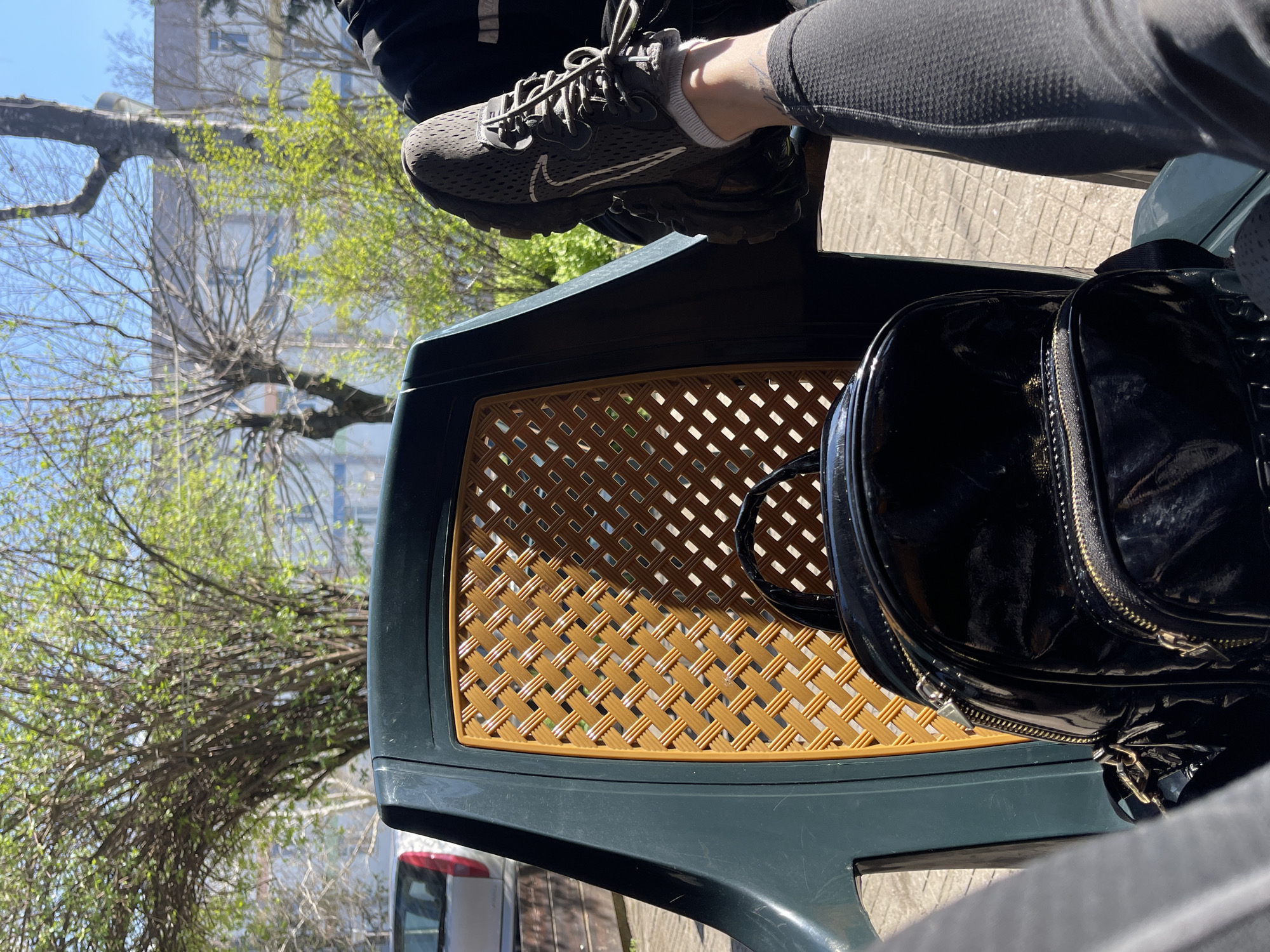 An eye-level, outdoor shot shows a black Nike sneaker, grey leggings, and a black patent leather backpack on a green plastic patio chair with a woven amber-colored seat. The person wearing the shoe is presumably seated. A tree with new green leaves is visible in the background, along with a blurry building. A small white vehicle with a red roof is also partly visible. The specific location cannot be determined based on visual data.