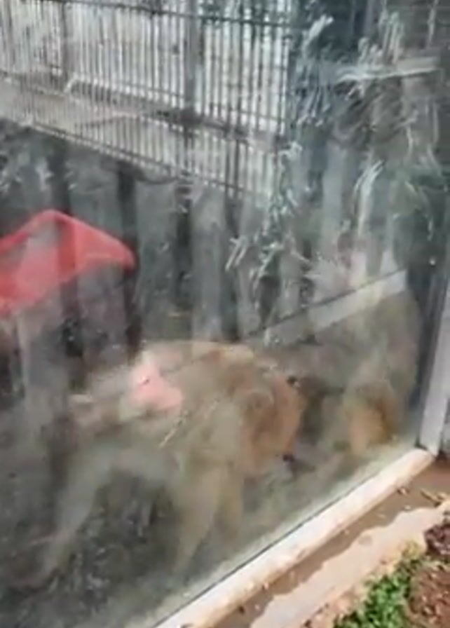 two monkeys in a cage. The monkeys are visible through a dirty glass panel. One monkey is sitting down, while the other moves around. A red object is partially visible in the cage as well. The cage has metal bars. Outside the cage, there is some greenery.