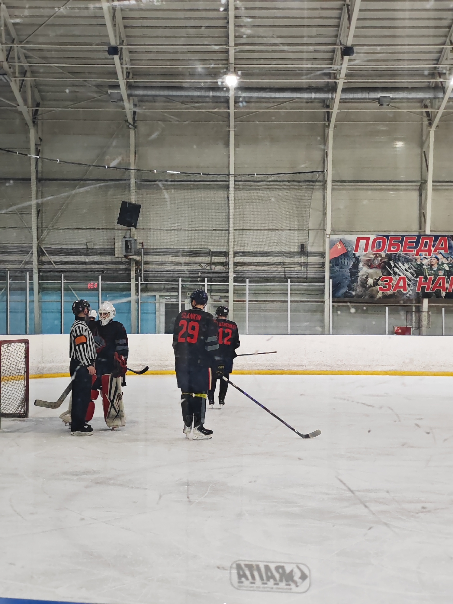 The image depicts a hockey rink in Saint Petersburg, Russia. Four figures are visible on the ice. A referee in a striped uniform stands conversing with a hockey goalie in protective gear. Two hockey players in black jerseys with red numbers (29 and 12) stand nearby, facing away from the camera. Player 29 has the name "SLANKIN" on his jersey, and player 12 has "ASHENCO". One of the players holds a hockey stick. The arena is indoors with a large poster of "ПОБЕДА ЗА НАМИ!" in the background, a Soviet WWII slogan. The ice is marked with an "ATIAK" logo. The rink has a metal grid on the walls and netting above the ice.