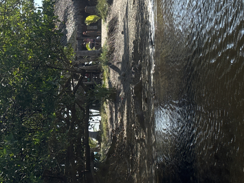 A body of water reflects the sky. The shore is partially obscured by trees with dense, green foliage. A structure with a thatched roof stands inland. People are visible on the porch, partially shielded by plants. The scene has a tropical or marshy feel.