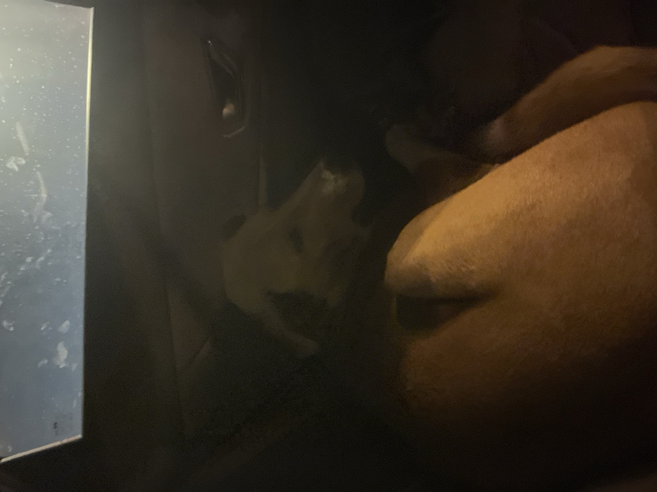 The image depicts a dimly lit scene inside a vehicle, located in Sdot Dan Regional Council, Israel. A light-colored dog, possibly white or cream with darker markings on its head, is visible in the mid-ground, facing right with its head in profile. Its body is largely obscured by shadow and a prominent, bent, orange-brown human leg or thigh, which occupies the lower left foreground of the frame. Visible elements of the vehicle include a dark interior panel, a silver door handle on the right side, and an upper window showing a blurry exterior with faint light patterns, possibly from ambient illumination or precipitation.