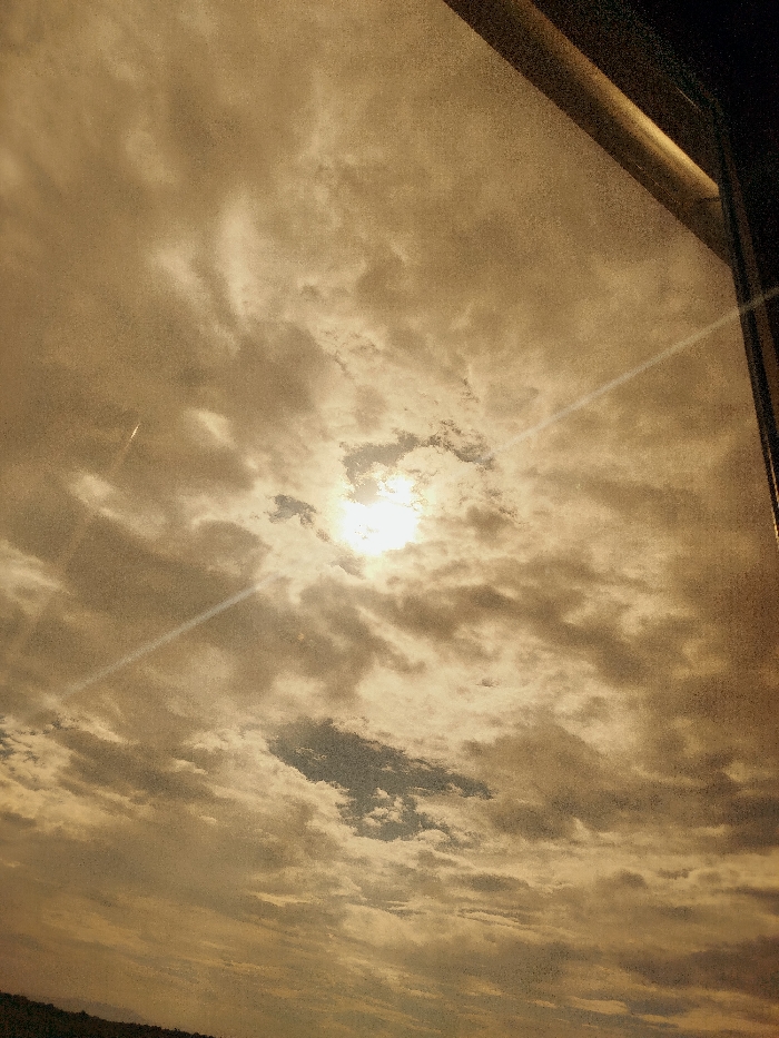 A sepia-toned sky is filled with dense, textured clouds, obscuring the sun which shines brightly through a small opening. A streak of light extends from the sun. The composition is slightly tilted, revealing a window frame along the top right edge. The lower edge shows a hint of trees or vegetation in the distance. The overall impression is one of atmospheric intensity.