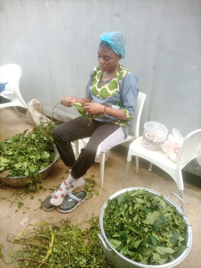 In the city of Opete, Nigeria, an adult female is depicted seated on a white plastic chair, engaged in manual vegetable preparation