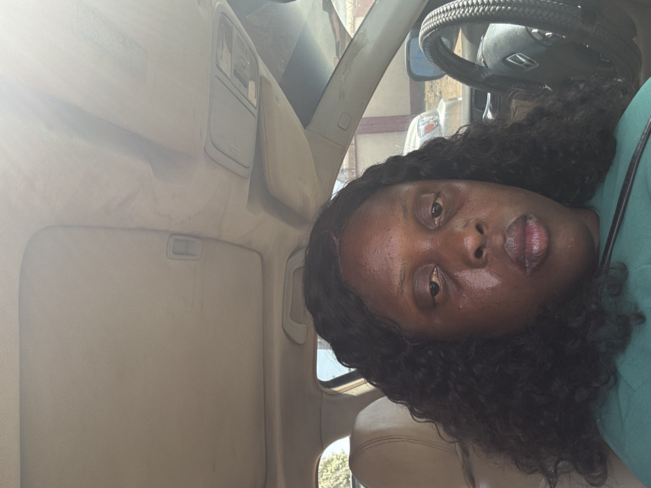 The image displays an adult individual, identified as female, positioned in the driver's seat of a motor vehicle