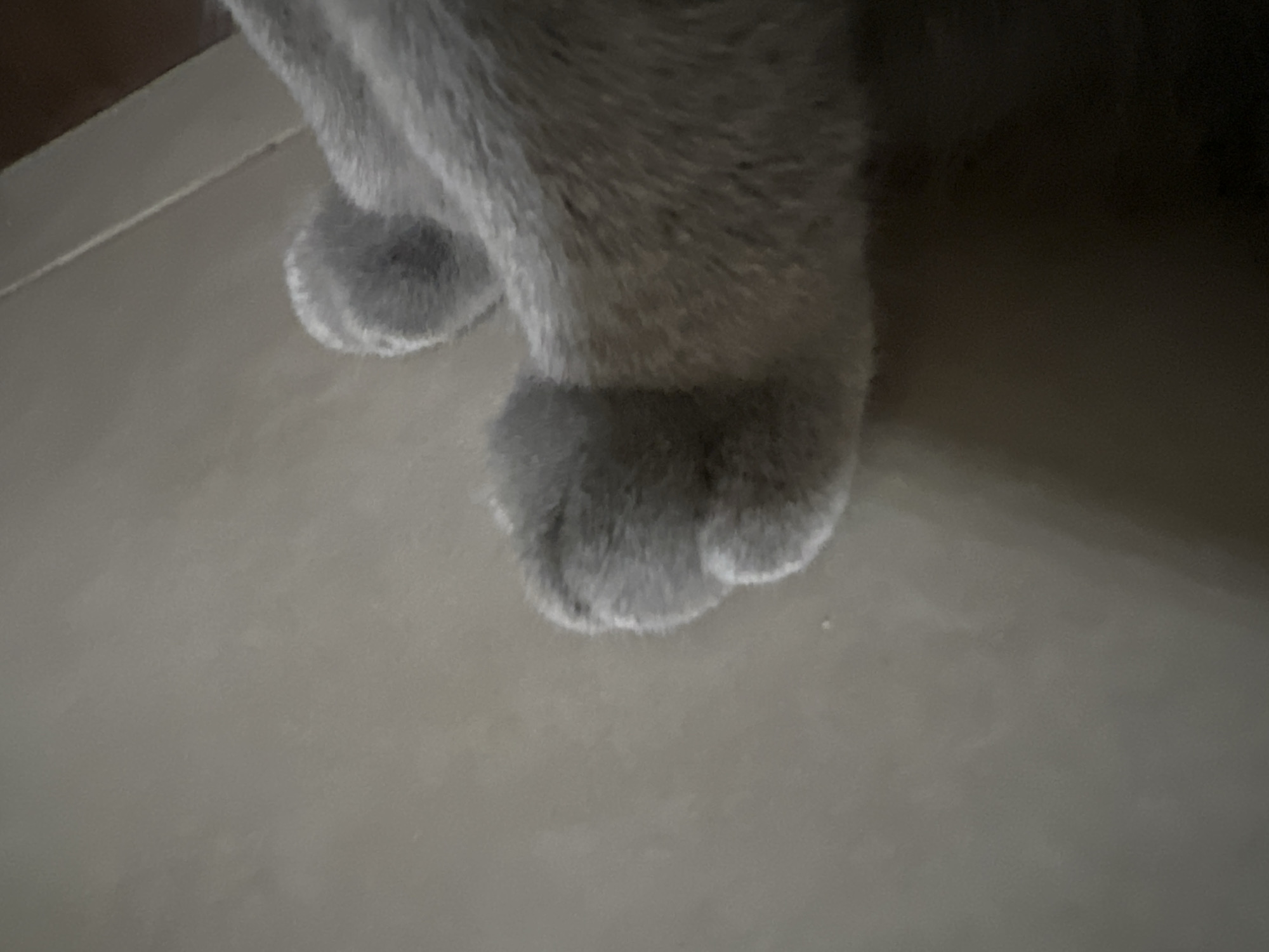 A close-up, high-angle view depicts the two front paws and a portion of the grey fur of a domestic cat