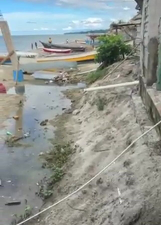 sandy beach with several colorful boats pulled ashore. The sky is blue with puffy white clouds. People are visible in the distance, some standing on the shore and others in the water. A narrow channel of water runs across the beach, containing some debris. The camera pans slightly, revealing a building to the right, close to the water's edge. A white pipe runs along the sandy bank near the building. There are a few scattered objects on the beach, including what appears to be a tire, a bucket, and some construction materials. The overall scene appears to be a coastal area with signs of human activity and some litter.