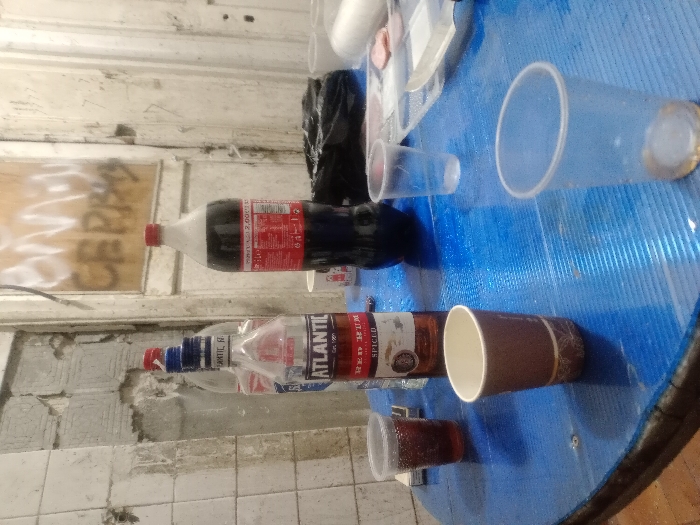 The image depicts an indoor scene within the city of Samokov, Bulgaria. A round table covered with a blue corrugated plastic sheet serves as the primary surface in the foreground. On the table, a 700ml bottle of "ATLANTIC RED RUM SPICED" is centrally positioned. Behind it are two clear plastic bottles, one with a red cap and one with a blue cap. To the right of the rum bottle, a 2.0-liter plastic bottle of Coca-Cola stands next to a crumpled black plastic bag. Four disposable cups are visible on the table: a clear plastic cup on the far left contains a dark red liquid; a brown paper cup with a decorative band is empty in the foreground; and two additional clear plastic cups, one empty and one with minimal residue, are also present. A small dark rectangular object, possibly a cigarette pack, lies near the clear cup containing liquid. On the table's far right, partially obscured, are several small white plastic containers and a clear plastic tray holding pink, sliced items. The background features a damaged wall on the left with exposed, peeling light-colored tiles or plaster. To the right, a light-colored wooden door or panel is visible, marked with white graffiti, including the Cyrillic characters "СЕРЕО." The overall environment suggests a neglected or dilapidated interior space. No individuals are present in the frame.