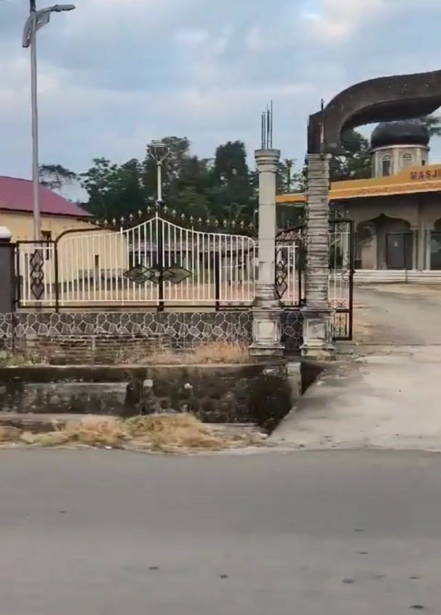 The video captures a view from a moving vehicle as it passes through a neighborhood. Initially, an arched gate with weathered stone pillars is visible. The vehicle then passes by a mosque named "Masjid Istiqamah," indicated by a sign in Arabic and Indonesian. The mosque is surrounded by a fence and includes a traditional dome. The landscape consists of houses, trees, and a roadside business displaying what appears to be stone or marble slabs. The sky is overcast, suggesting either early morning or late afternoon.