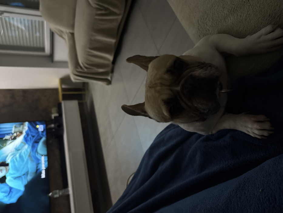 A tan and white French bulldog sits on a dark blue blanket. The dog is facing away from the camera and looking toward a television in the background. The television screen is displaying a show with people wearing blue clothing. A beige sofa is partially visible in the upper left corner of the image. The background is out of focus.
