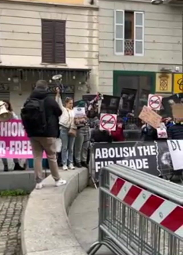 group of animal rights protestors holding signs and banners, including one that reads "Abolish the Fur Trade" and another "Fashion Fur-Free