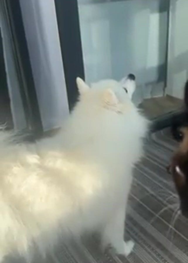 A brief video depicts a white Samoyed dog standing by a glass door or window inside a home