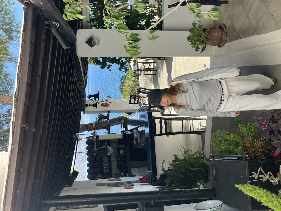 The image displays an outdoor dining area of a restaurant or cafe situated in Megalochori, Greece, with a clear view of a large body of deep blue water and distant landmass under a bright blue sky. In the foreground and midground, a single female subject with shoulder-length light brown hair is visible, wearing a dark grey bucket hat, a light grey long-sleeved top, white wide-leg trousers, and carrying a white tote bag on her left shoulder. She is walking towards the right side of the frame, looking slightly to her left. The establishment features white stucco walls and a dark wooden pergola roof structure providing shade. To the left, a black, curved bar counter with three high-backed bar stools is present. Behind the bar, shelves hold a red kettle, a coffee maker, and various other containers. A disco ball and other hanging light fixtures are suspended from the wooden beams. In the lower left foreground, a black, square-shaped oven or stove is visible, surrounded by potted plants including ferns and flowering species. To the right of the woman, and further into the background, a paved patio with several dark wooden chairs and light-colored tables is arranged, offering seating with a direct view of the sea. Additional potted plants and a large tree trunk are also visible on the right side of the frame. The scene is illuminated by natural daylight, casting shadows.