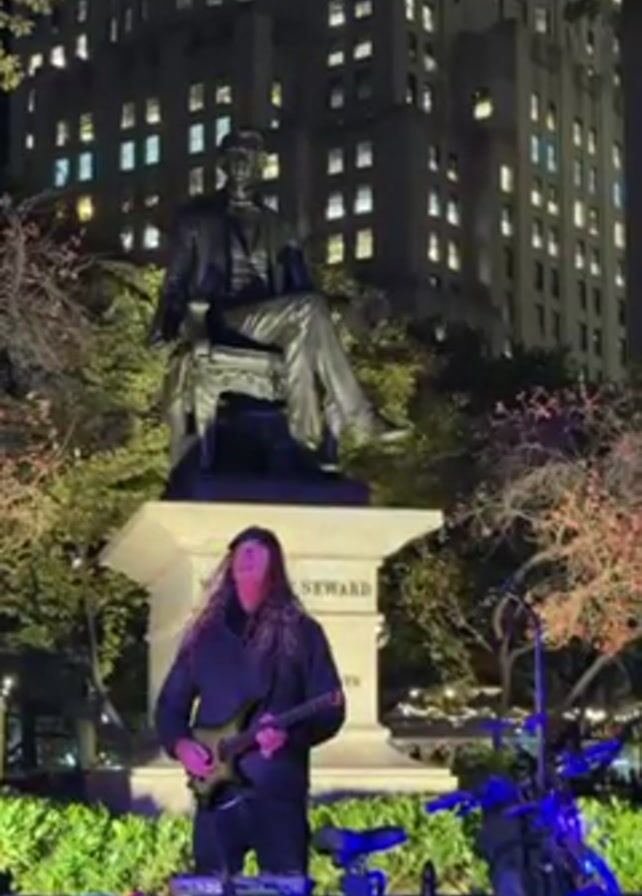 man playing an electric guitar in front of a statue in a park at night. The man has long hair and is wearing a black jacket and baseball cap. The statue behind him is of a seated figure on a pedestal that reads "WILLIAM H. SEWARD." The backdrop consists of a tall building lit up at night and foliage, and there is a bicycle with gear set up in front of the man. The scene appears to be set in an urban park environment after dark.