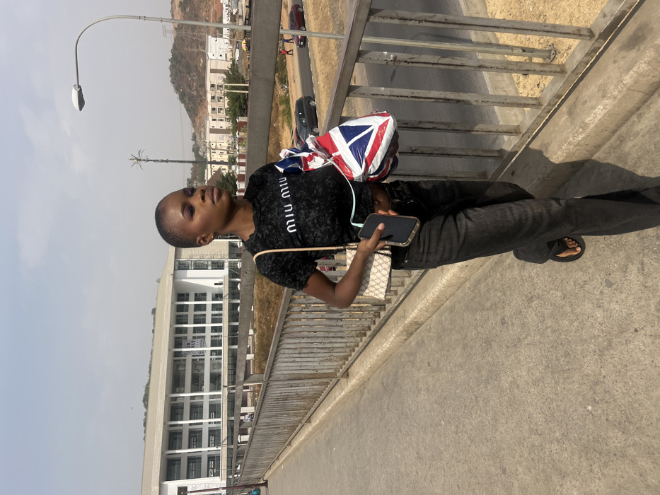 The image captures a female walking on a concrete pedestrian overpass in Gwarinpa, Abuja, Nigeria, under a hazy sky during daylight