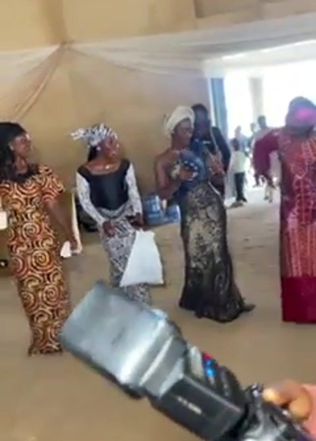 A group of four women are dancing in a room, likely at a celebration. Each is wearing a unique, colorful patterned dress. The woman in the middle is holding a white plastic bag. They are all smiling and appear to be enjoying themselves. In the background, more people are visible, and some decorations are present. The camera is held by a person who is partially visible in the foreground. The lighting is bright, and the atmosphere appears festive.