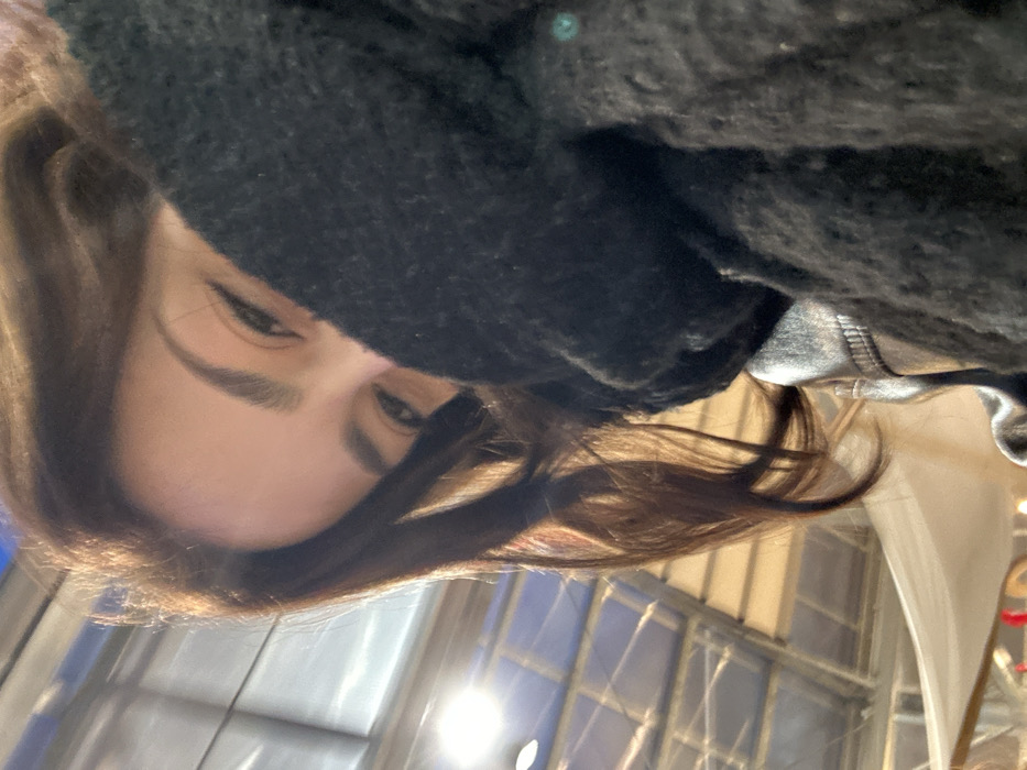 A close-up, slightly tilted shot focuses on a person's face partially obscured by a dark, textured scarf or garment. Only the eyes and forehead are clearly visible. The hair is brown, with some strands falling across the face. The background features bright, diffused light and geometric architectural elements that appear to be windows or glass panels. The image is well-lit but lacks sharp focus.