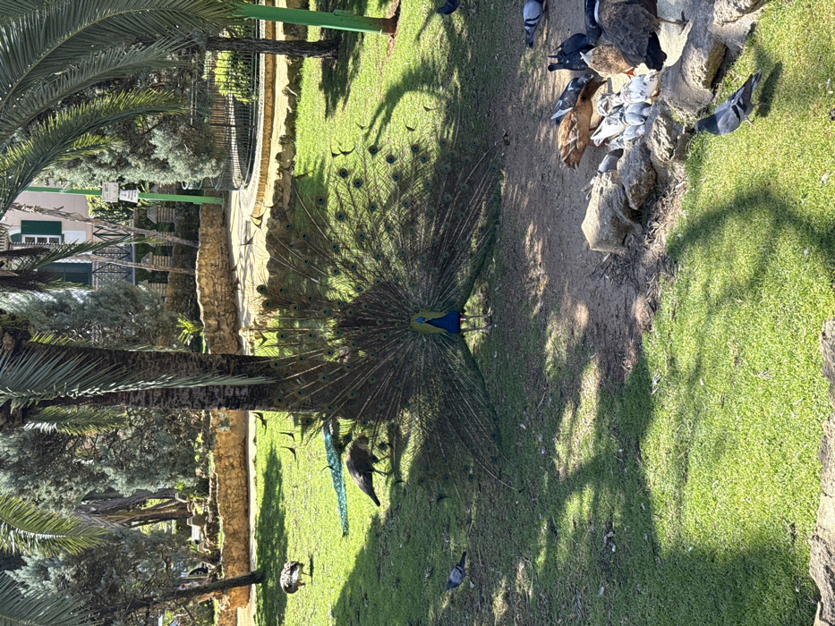 The scene depicts a sunlit section of a park in Dos Hermanas, Spain, characterized by green grass, dirt paths, and dense foliage. A male peacock, displaying its fully fanned blue-green tail, stands prominently on a central dirt patch, oriented towards the observer. To its immediate left, on the grass, a darker peafowl forages, while a lighter-colored peafowl is visible further left. Another peafowl is present in the far-left background. In the foreground right, a gathering of approximately a dozen pigeons and several domestic ducks (varying in brown and dark plumage) are observed foraging on a dirt area adjacent to several light-colored rocks. Overhead, numerous large palm trees, including one central to the composition, cast distinct shadows across the sun-dappled ground. A low, curved stone wall delineates a paved section in the mid-ground, behind which a black metal fence encircles a landscaped area. A multi-story building with multiple windows and green shutters is partially visible through trees in the distant background.