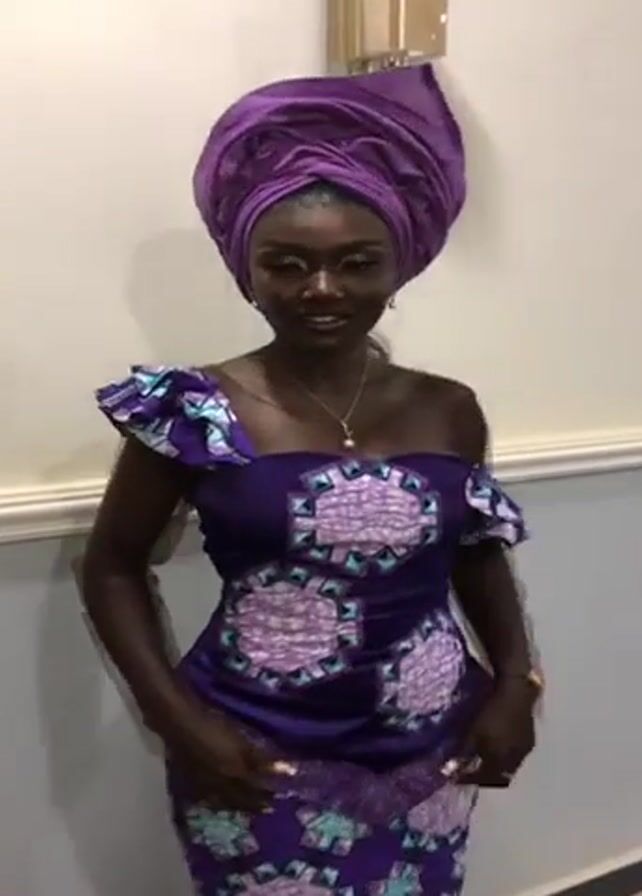 A young, dark-skinned woman stands in front of a light-colored wall, wearing a matching purple dress and headwrap