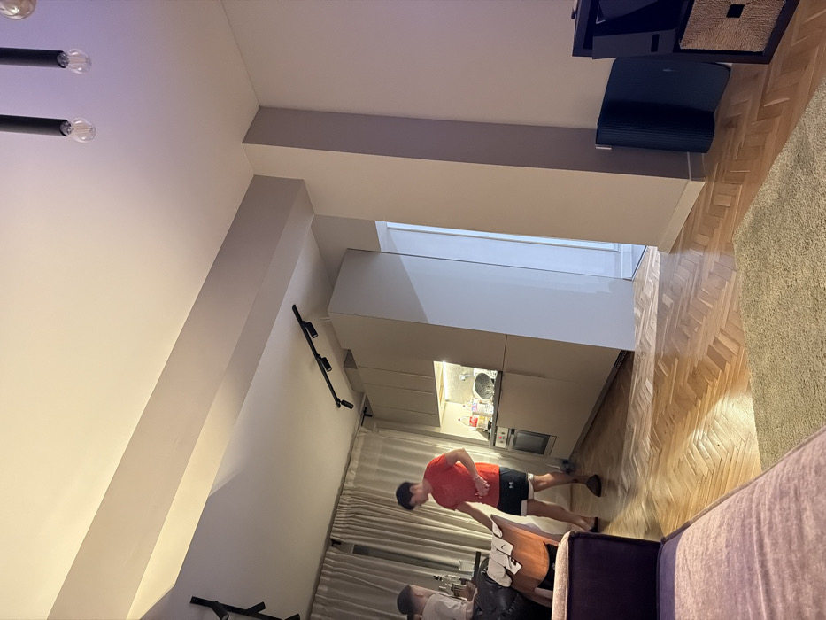 The image depicts an interior residential space, identified as being in Varna, Bulgaria. The scene captures two individuals within a combined living and kitchen area, illuminated by artificial lighting from multiple fixtures. On the left, a person wearing a light-colored top is partially visible, seated at a dark-toned table. On this table, several bottles, including one resembling a spirit bottle, and multiple glasses are present. An upholstered chair with a wooden frame is positioned to the right of the seated individual. In the central area, a male individual stands, dressed in a red short-sleeved shirt, dark shorts, and brown slippers. He is positioned facing a modern kitchen counter and holds a small, light-colored object in his right hand. The kitchen features light-colored, minimalist upper and lower cabinets, an integrated oven, and a sink on the countertop. Various dishes and bottles are visible on the counter. Under-cabinet lighting illuminates the kitchen workspace. The floor throughout the visible space is covered in herringbone-patterned wooden parquet. In the immediate foreground, a light-colored textured rug is situated on the floor, in front of a partially visible purple or mauve upholstered sofa. Light-colored, full-length curtains cover a window or glass door on the far left. The ceiling is white and features black track lighting fixtures with spotlights, along with a separate fixture containing exposed bulbs further to the right. Structural elements include a prominent light-grey ceiling beam and a vertical light-grey column on the right side of the frame. A brightly lit open doorway or passage is visible beyond the kitchen area. On the far right, a dark cube-style storage unit is partially visible, with a dark-colored folded mat leaning against an adjacent wall.
