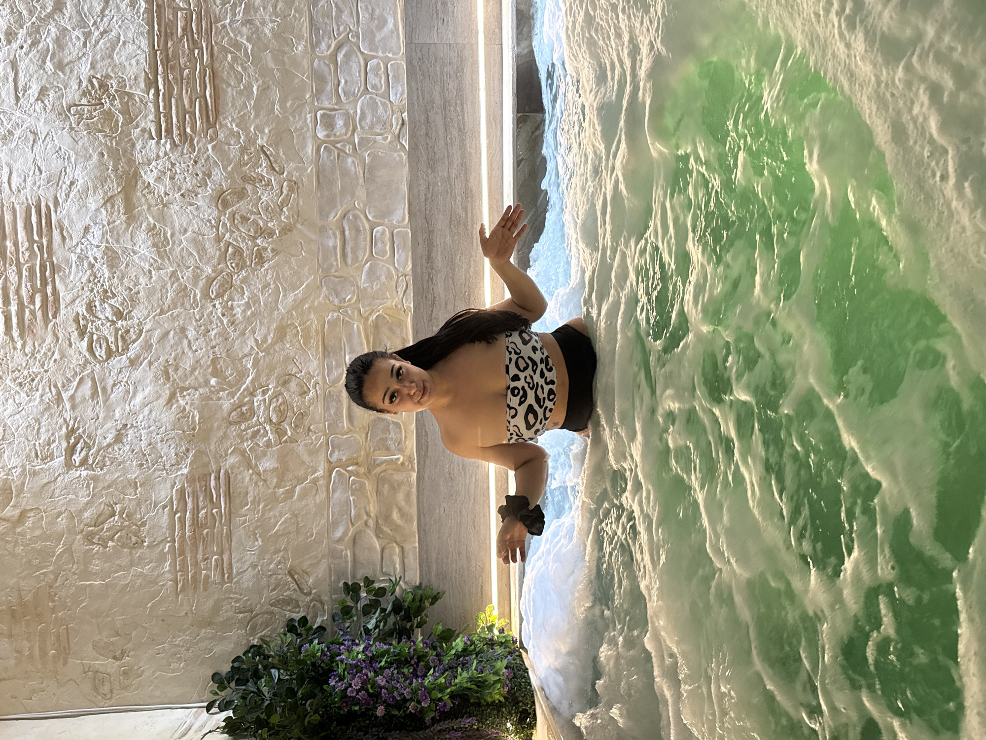 A woman in a white and black leopard print bikini top and black shorts is in a hot tub with foamy green water. The background shows a textured wall and a tiled wall with a strip light. Plants are at the base of the wall. The location is not specified but might be Sofia, Bulgaria.