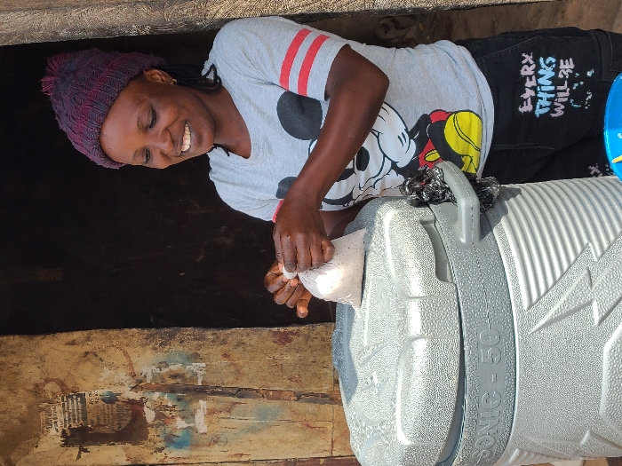 An adult female is standing in an outdoor or semi-outdoor setting within the city of Unknown, Unknown. She wears a grey short-sleeved t-shirt with a Mickey Mouse graphic, black shorts with text, and a dark knit beanie. The female is smiling as she manipulates a small, translucent plastic bag containing a light-colored granular substance, holding it with both hands directly above the lid of a large, grey cylindrical plastic cooler. The cooler is marked "SONIC - 50" on its side. The background features a distressed, light brown wall or structure with remnants of paper or posters adhered to its surface, and a dark recessed area to the right, indicating a doorway or shadow. A blue object is partially visible at the bottom right of the frame.