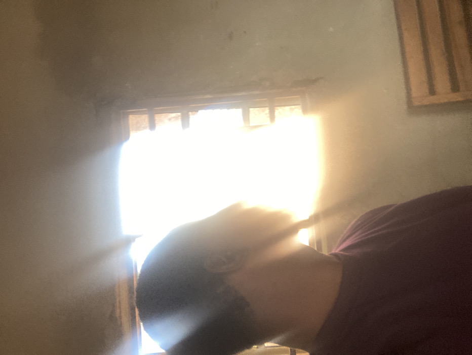 The scene is an interior room located in Kakau, Nigeria. A person, viewed from the shoulders up, occupies the left side of the frame, positioned in profile facing right. The individual wears a purple short-sleeved shirt. Their face is obscured by intense, bright light emanating from a window on the right side of the image. The window features dark-colored vertical and horizontal bars. Distinct sunbeams are visible radiating from the window into the room's interior. The room's walls are a light, muted tone. In the lower right quadrant, a section of a wooden object with horizontal slats, consistent with a bed headboard, is partially visible.