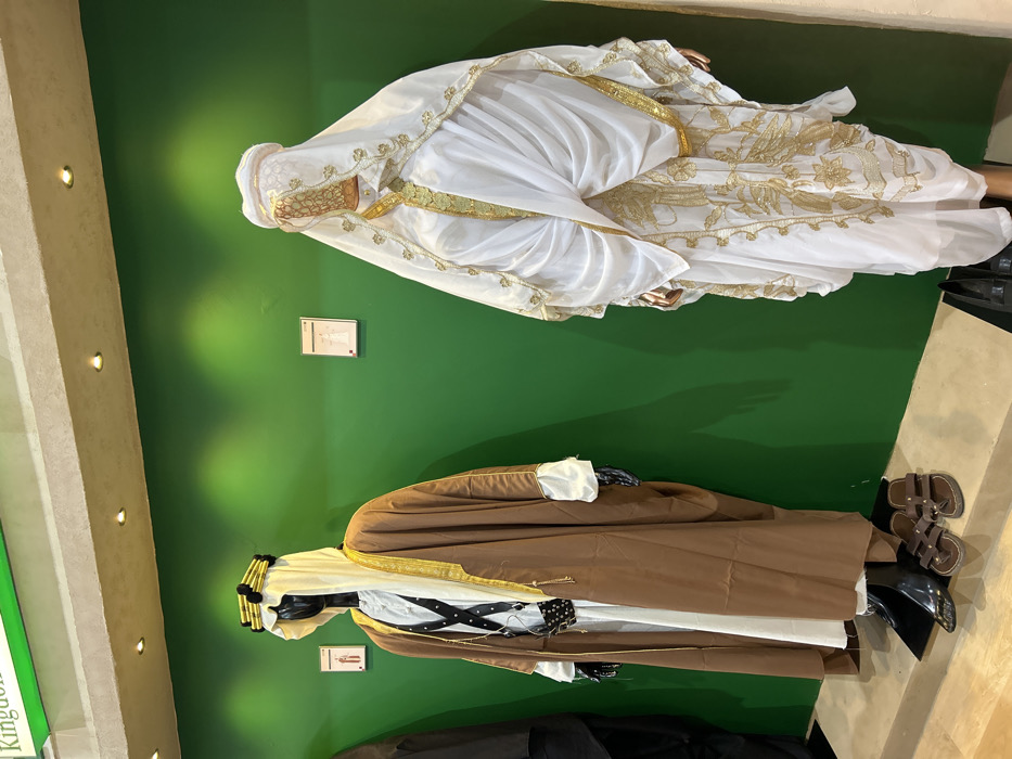 The image displays an indoor cultural exhibit featuring two mannequins dressed in traditional Middle Eastern attire against a solid green wall