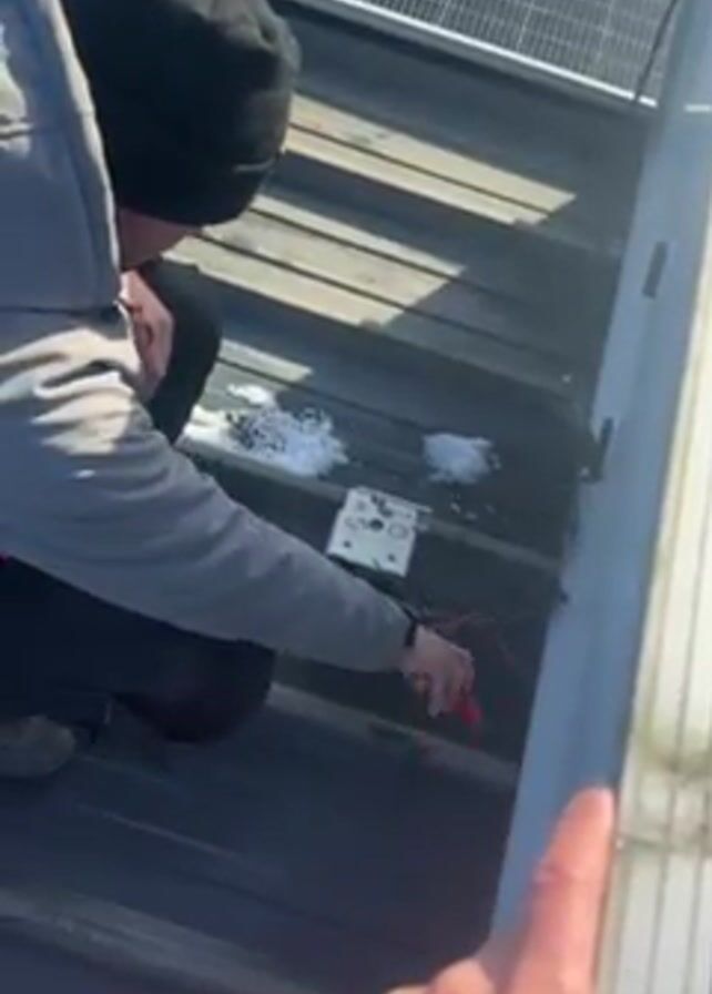 Two people are on a rooftop with solar panels, with one individual pointing at the panels while the other kneels and works with wires and a small electrical box using red handled pliers. A small amount of snow is also visible. The kneeling individual is wearing a black beanie, gray hoodie and tan shoes.
