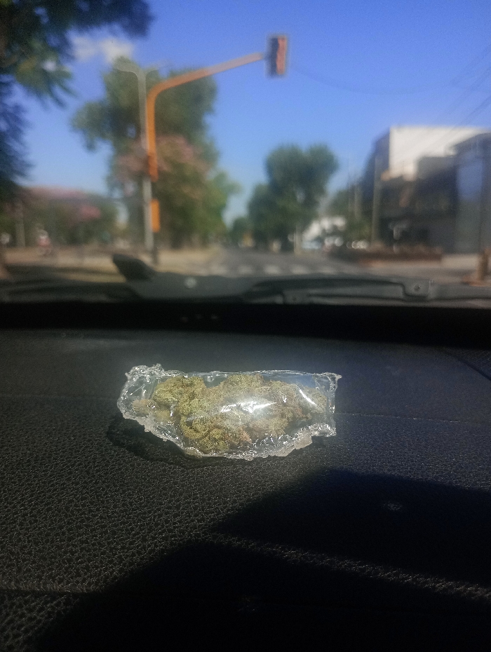 A small package of what appears to be marijuana sits on the dashboard of a car. The package is wrapped in clear plastic. The background shows a blurred street scene with a traffic light and buildings. The car is likely in motion. The dashboard has a textured surface. Sunlight creates a strong shadow in the lower part of the frame.