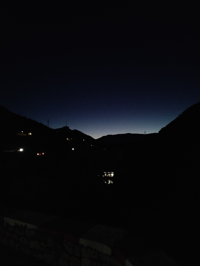 Night envelops a mountainous landscape. Silhouetted hills frame a gradient sky transitioning from deep blue to near black. Dim lights from scattered buildings punctuate the dark slopes, their reflections shimmering in a body of water below. A stone structure occupies the foreground, barely visible in the darkness. The scene evokes a sense of stillness and solitude.