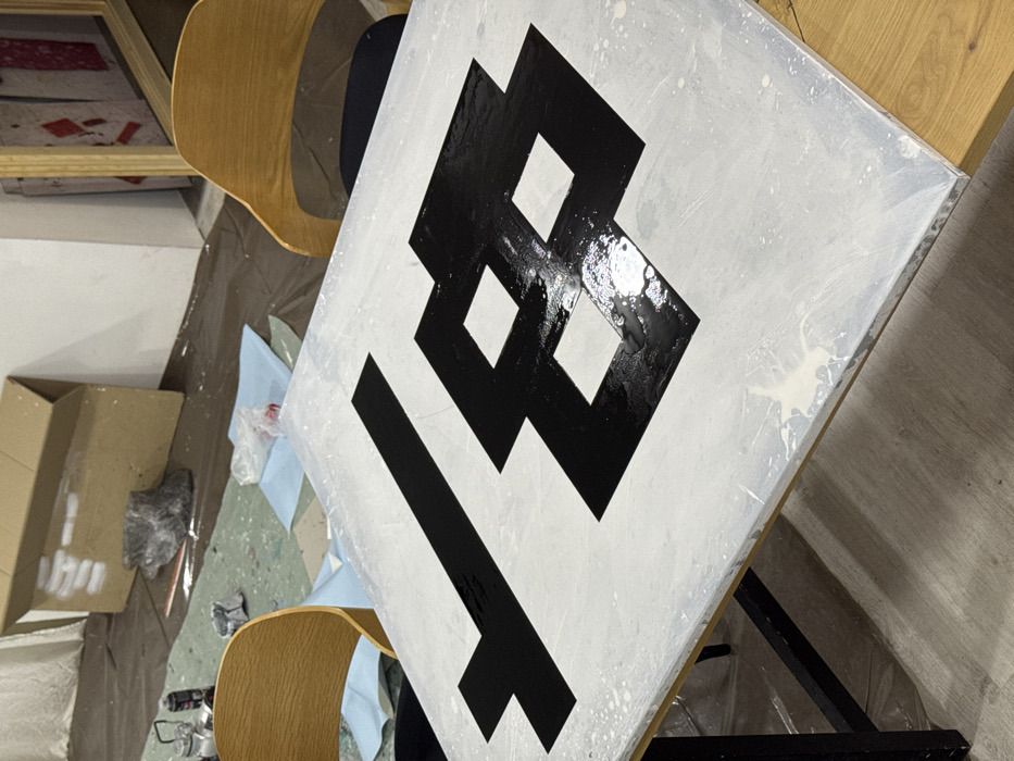 A rectangular table, tilted slightly, is the primary focus. The surface is white with a bold black graphic. The black paint appears wet or freshly applied. Two wooden chairs are positioned near the table. A partially visible cardboard box, along with other items, sits on the floor beneath the table and chairs. The setting suggests a workspace.