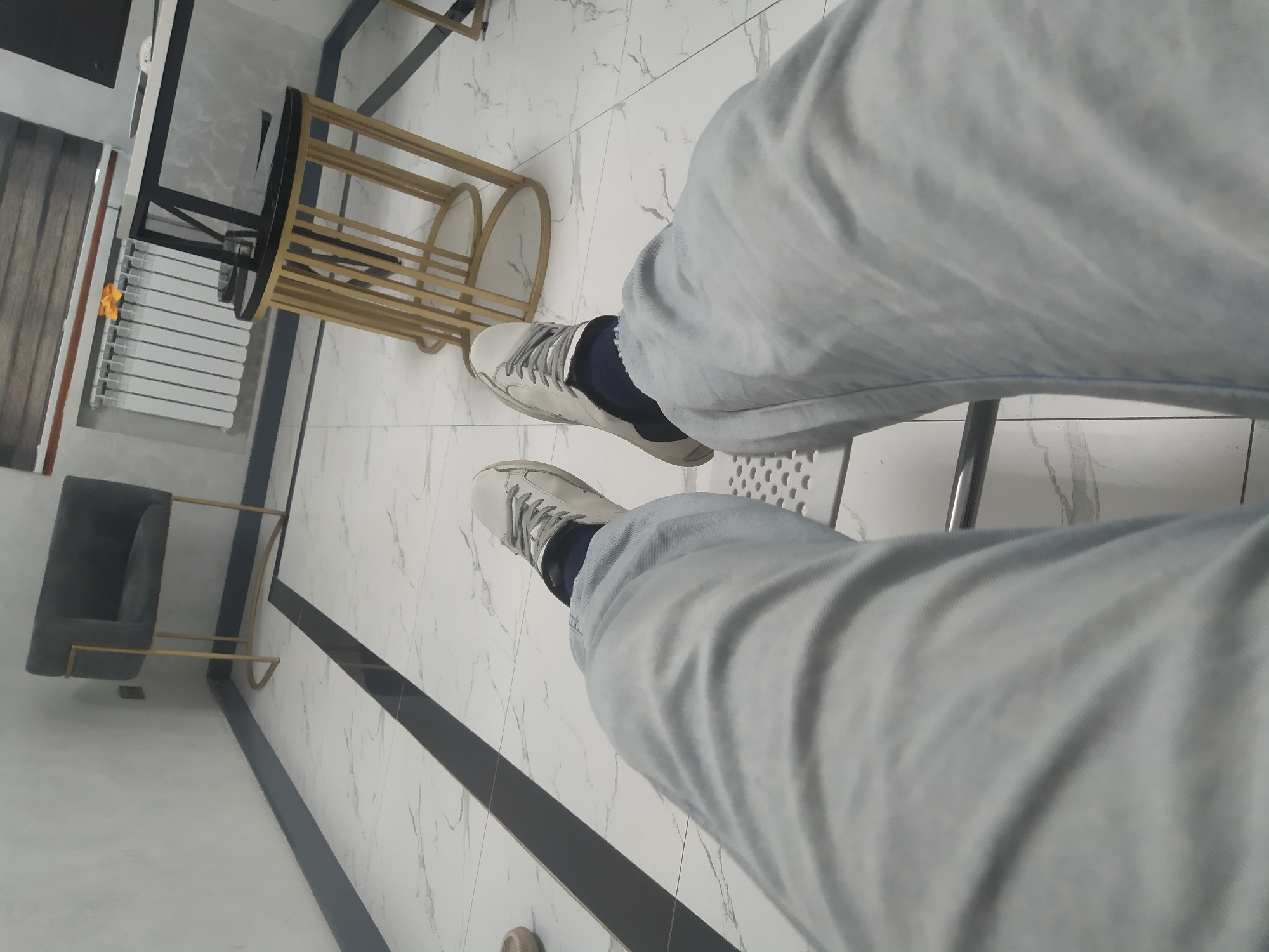 The image captures a first-person, downward view of a person's lower legs and feet, seated in a contemporary indoor room located in Tashkent, Uzbekistan. The subject's legs are clad in light blue jeans, dark blue socks, and white lace-up sneakers featuring grey laces and dark soles. The feet are extended forward, resting on a white tile floor patterned with grey veining, bisected by a prominent black strip running centrally through the foreground and midground. In the background, against a light grey wall, a dark grey upholstered armchair with a gold-colored metal frame is positioned to the left. To the right, a small side table with a black top and a gold-colored slatted cylindrical base stands near a white, horizontally-oriented radiator mounted beneath a window with horizontal blinds. A small, crumpled yellow object rests on top of the radiator. A portion of a larger black and white table is visible on the far right side of the frame.