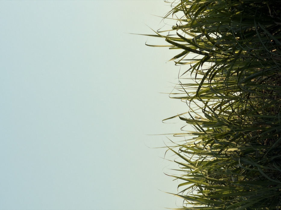 Green, grassy plants fill the right side of the frame. The sharp, linear blades overlap and point upwards. The left side of the image features a soft blue sky. The sunlight gently illuminates the plants, creating subtle variations in their green hues. The composition has a strong diagonal separation between the natural elements.