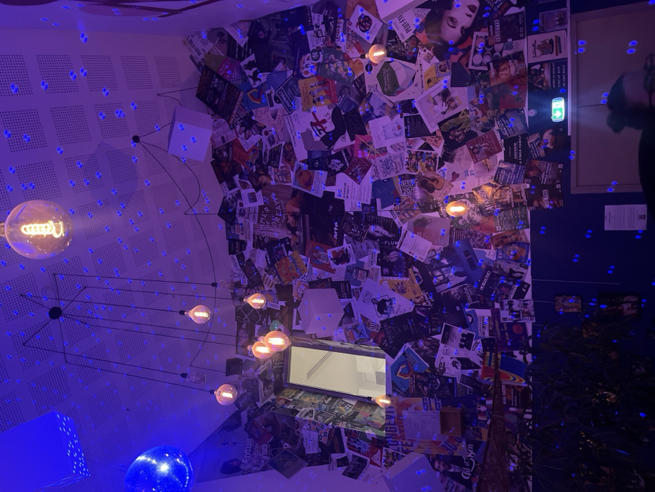 room with walls covered in posters and flyers. The room is lit with a combination of Edison bulbs and blue lights, creating a vibrant atmosphere. Words like "Endzeit", "LONGEVI", "UMMER OF DREAMS", "VEDETTE", and "FLUI" are visible. The flyers feature varied designs, possibly advertising music or cultural events. Some posters have images of faces. Overall, the space seems artistic and full of visual stimuli.