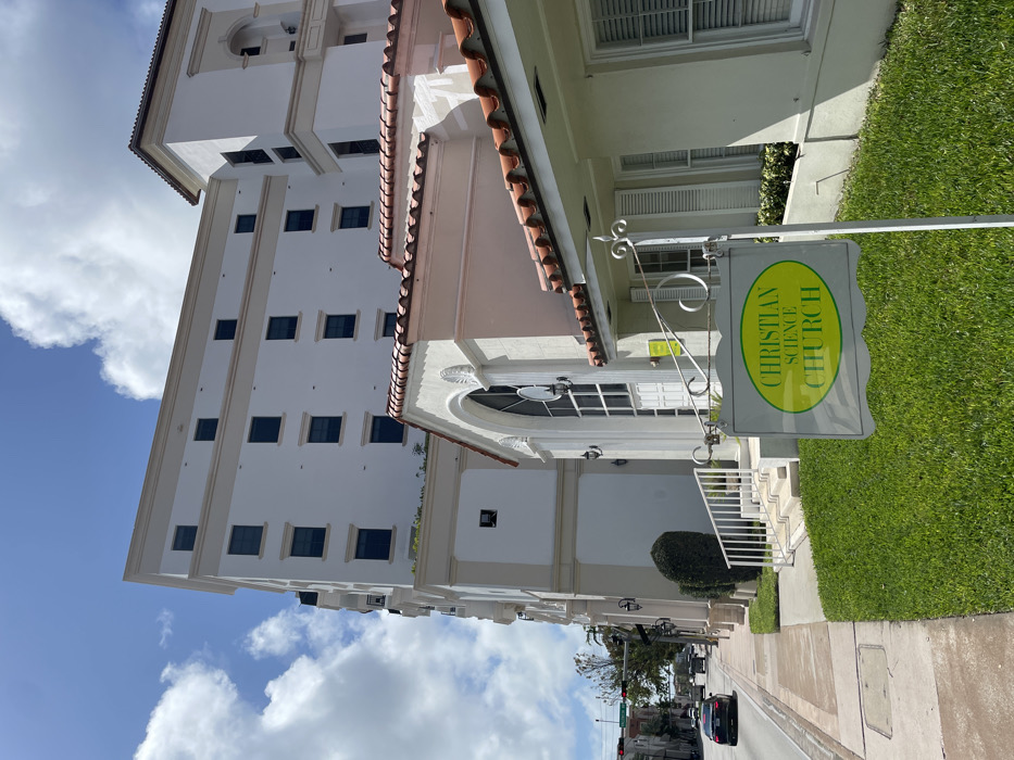 A daytime photograph displays an urban street scene in Coral Gables, Florida, United States of America, under a partially cloudy blue sky. In the foreground, a white, ornate metal-framed sign is anchored in a manicured green lawn. This sign features a yellow-green oval containing the text "CHRISTIAN SCIENCE CHURCH" in green lettering. Behind the sign and lawn, a single-story building with a light-colored stucco exterior and a reddish-brown terracotta tile roof is visible. This structure includes windows fitted with white louvered shutters. To the immediate left, a set of white steps with white metal railings ascends to a prominent arched entrance, which incorporates a large round-top window and a white paneled door. Two wall-mounted light fixtures are positioned on either side of this entrance. Adjacent to the lawn and the smaller building, a concrete sidewalk runs parallel to a paved street. Multiple dark-colored passenger vehicles are observed on the street, heading away from the viewer towards a distant intersection where traffic lights are visible. Directly behind the single-story church building, a much taller, multi-story building rises. This structure is predominantly white, featuring numerous uniformly-spaced dark, rectangular windows and a flat roofline, indicative of modern architecture. No individuals are distinctly visible within the scene.
