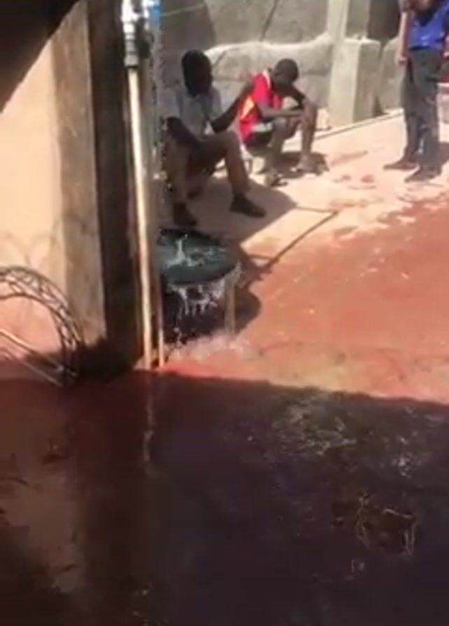 three young men in an outdoor setting. One man is sitting on a ledge next to a water spigot with a full black bucket beneath it, overflowing with water. A second man is squatting nearby. The third man stands off to the side, arms crossed. The ground is covered in water, and a fence with razor wire is visible in the background. The wall to the left is light tan, and the water tank is black. The wall behind the men is concrete. The overall scene suggests a water-related problem.