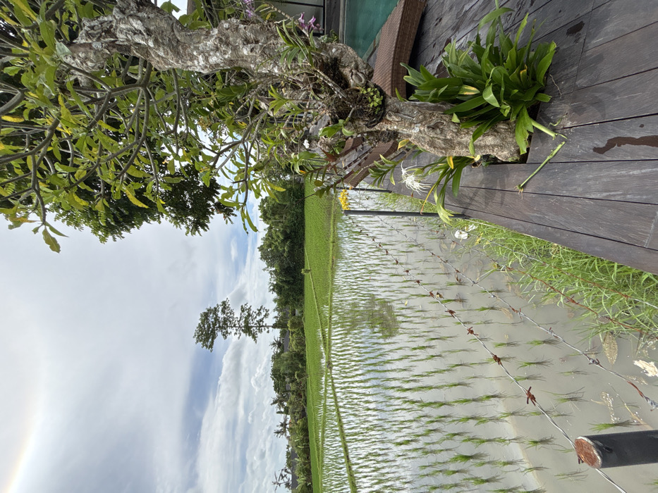 A close-up shot presents a tree trunk with orchids growing on it, set against a backdrop of a rice field filled with water. Seedlings form parallel lines across the watery surface, reflecting the sky and surrounding trees. Wooden decking borders the scene, with a partial view of a chair. The sky is overcast, casting a soft light.