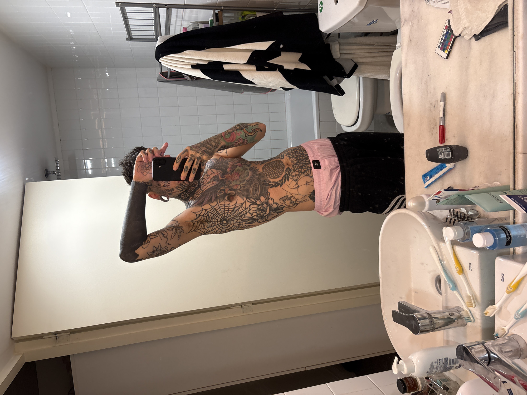 A shirtless man with extensive tattoos on his torso, arms, and hands is taking a selfie in a bathroom. He is holding a black smartphone in his left hand, partially obscuring his face. The bathroom features white tiles, a toilet, a sink cluttered with toiletries, and a mirror reflecting the scene. A black and white striped towel is hanging near the toilet. The location cannot be determined from the image.