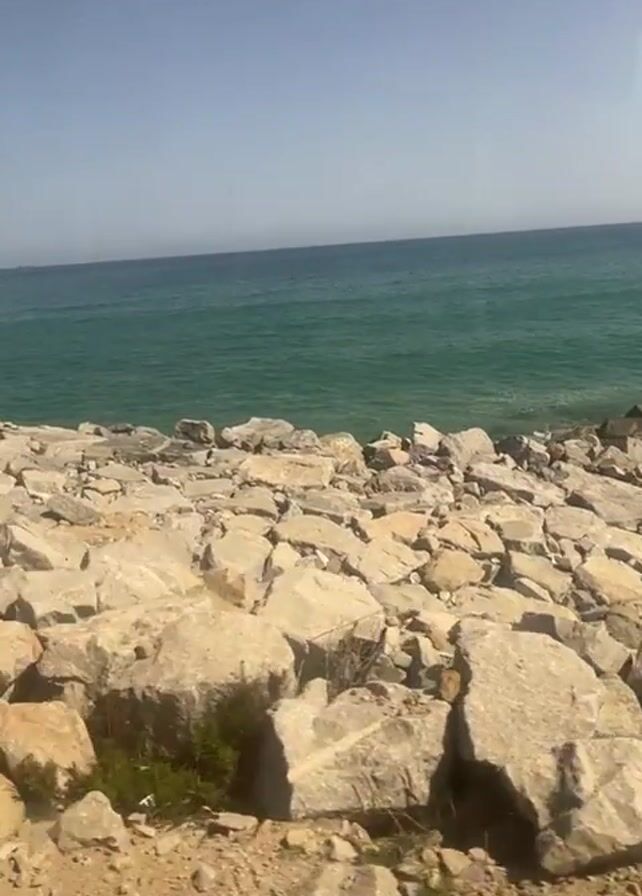 rocky shoreline next to the ocean. The water is a greenish-blue. A wire fence runs along the side of the road. Graffiti is visible on some of the rocks. A man in workout gear and a yellow safety vest runs along the sidewalk. The sky is clear and blue.