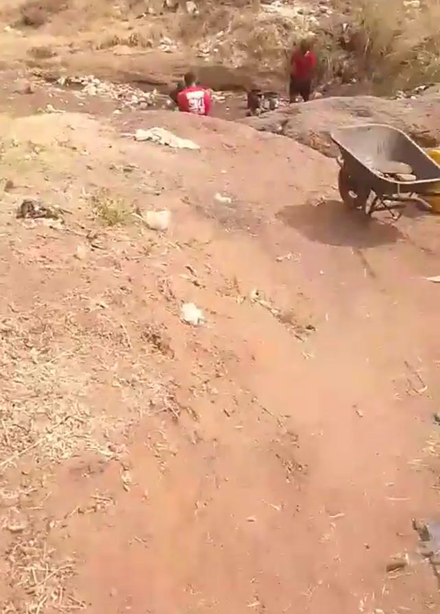 n outdoor scene in a relatively dry, dusty area. The ground is primarily reddish-brown soil with patches of dry grass and scattered debris. In the background, there are a few simple buildings that appear to be residential houses. Two people are present in the middle distance, both wearing red shirts. One is sitting down while the other is bending over, seemingly engaged in some kind of work or activity. There are buckets and other small objects near them. A wheelbarrow is positioned on the right side of the frame. The overall impression is a simple, possibly rural, setting where some kind of manual labor is taking place.